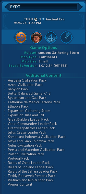 Civ6 и PYDT. Проверь включённые Моды при запуске игры у себя в Civ6.