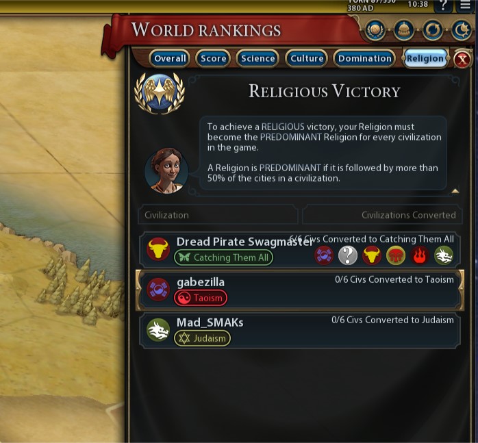 Good game folks! I have converted every civilization to my religion, and claim the Religious Victory! I use the PYDT discord if you want to chat about it as well.